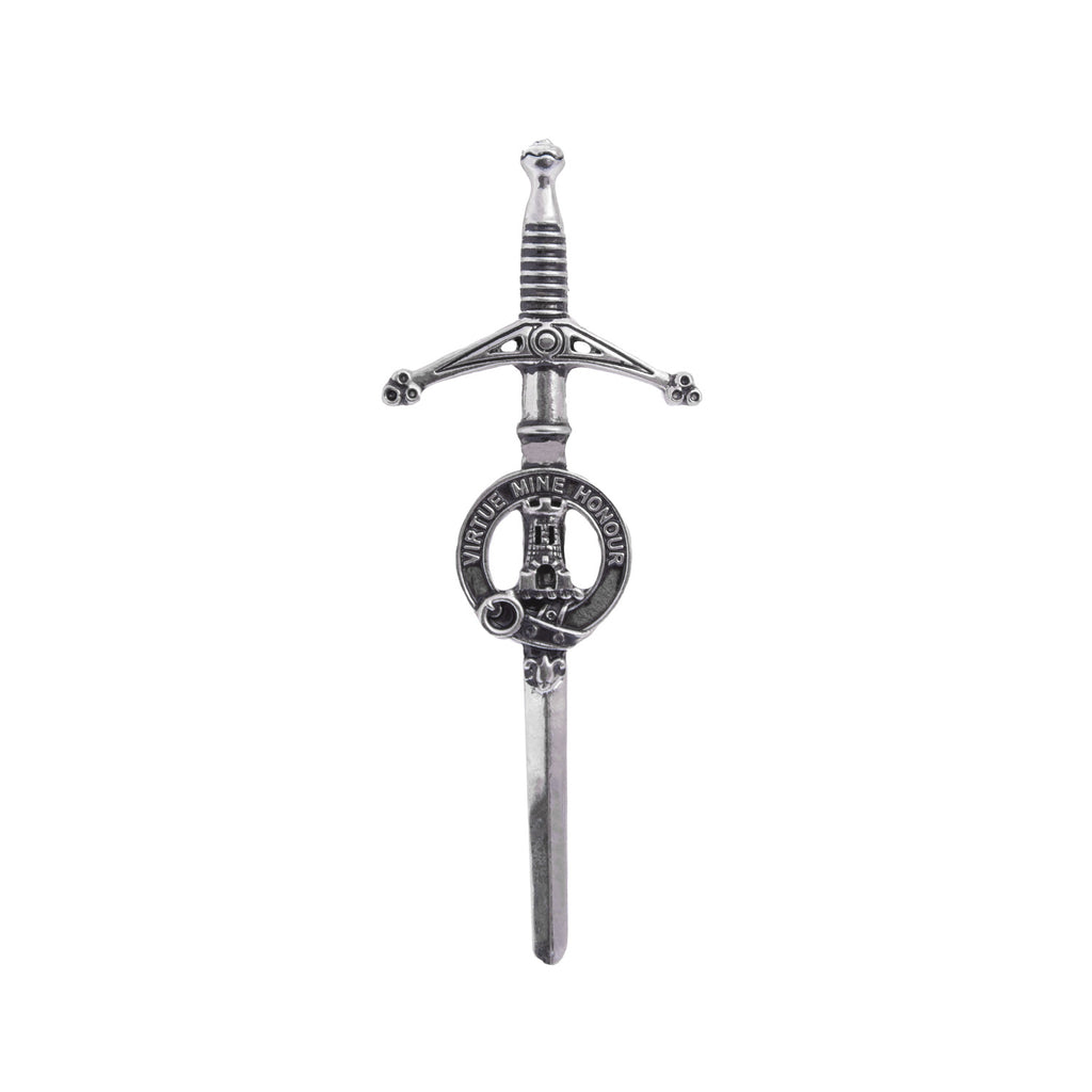 A wide selection of clan crested kilt pins.In ancient times, a Chief wore in battle a distinguishing badge on his helmet, a device which his followers could recognize in the turmoil of action. This is known as the Crest of the Chief and appears at the top of his Full Coat of Arms. Anyone bearing the same name as a Scottish Chief is a Clansman of the Chief and has the privilege of wearing his Crest surrounded by a Strap and Buckle Garter to denote his Clan Allegiance. The great Scottish Clans contain families who bore a different surname but were descended from the Chief through the female line. They are called Septs. Therefore anyone who has an ancestor bearing a Sept name or the Clan name itself has the privilege of wearing or displaying the Crest Badge.