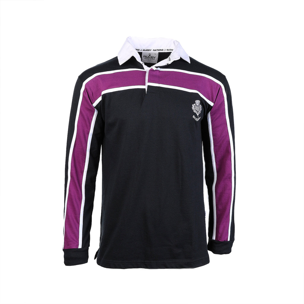 This new rugby navy color shirt has been especially designed by Rugby Nations Designs - Scotland. One purple stripe - front and back - and a white collar for a classic rugby look plus a Scottish thistle embroided on the front. 100% cotton for a soft feel and maximum comfort. Made with heavyweight fabric and rubber buttons. Great for games and casual wear.