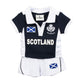 A quality kids sports kit that has "Scotland" printed across the top with a Saltire flag and the Scottish Thistle emblem above, completed with a pair of loose fitting white shorts.
