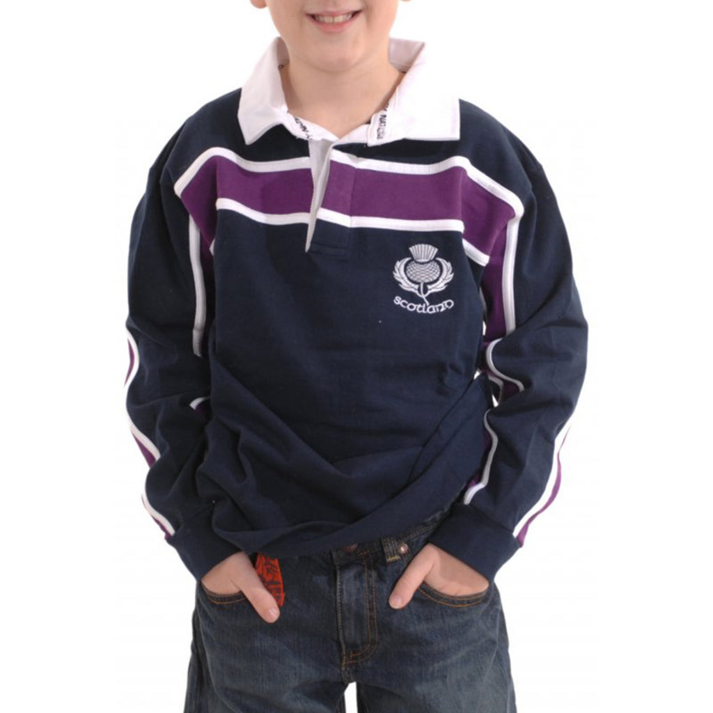 Rugby shirt for kids. With Purple stripe across the chest and Thistle embroidery. Easy to combine with jeans, dark trousers, sport shoes and casual jacket. Perfect wearing to school, family celebrations, sport events and meeting with friends. Comfortable and stylish.